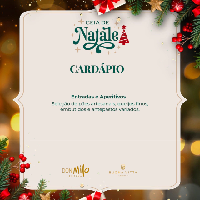 Não deixe de conferir o nosso menu cuidadosamente preparado para esta ocasião única. Prepare-se para se deliciar com pratos especiais que certamente farão desta ceia uma experiência gastronômica memorável.