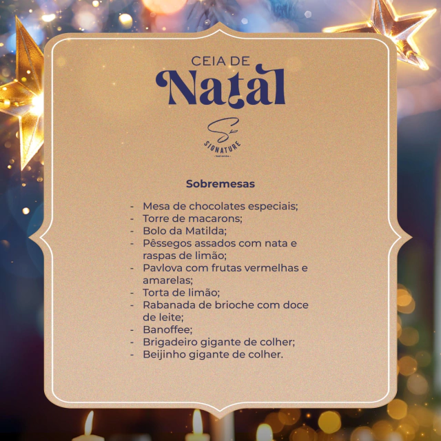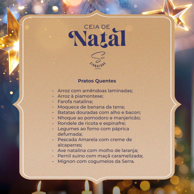 Não deixe de conferir o nosso menu cuidadosamente preparado para esta ocasião única. Prepare-se para se deliciar com pratos especiais que certamente farão desta ceia uma experiência gastronômica memorável.