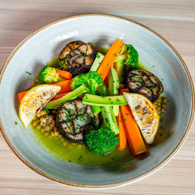 Peixe branco envolto em nori, vinagrete de limão siciliano, lentilhas e legumes tostados