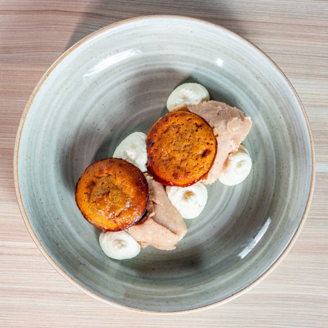 Palmito tostado com creme de moranga, picles de cebola roxa e farofa de castanhas